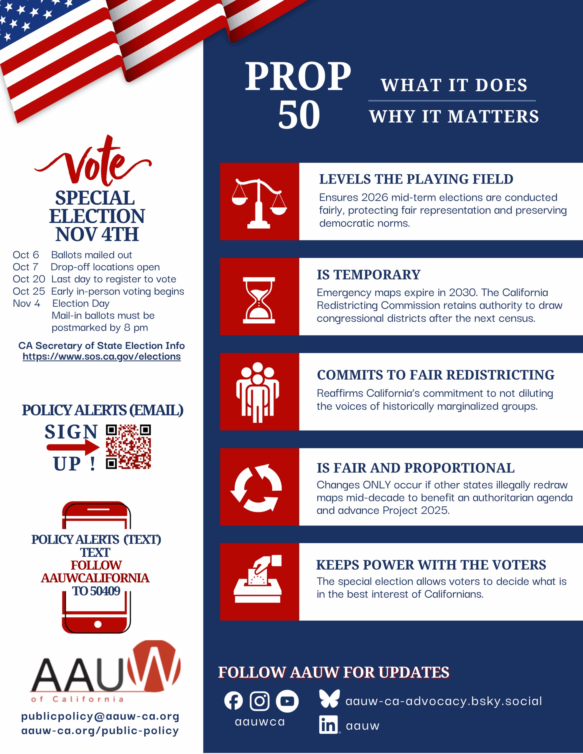 Now that we’ve begun our 2025-2026 program year, we turn our attention to the upcoming special election on Nov. 4 in California. AAUW of California has provided the following informative flyer: